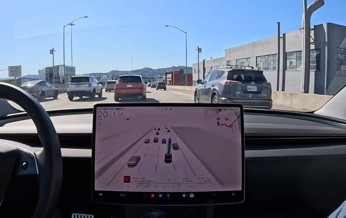 A mostrarci il funzionamento del sistema di guida di autonoma, in questo caso su una Tesla Model 3, è un video dell’account youtube Whole Mars Catalog che ci fa salire a bordo della berlina elettrica per un viaggio, totalmente gestito dal software Full-Self Driving (FSD), nella versione 13.2.7, di poco meno di 35 chilometri che vanno dall’aeroporto di Oakland a San Francisco.