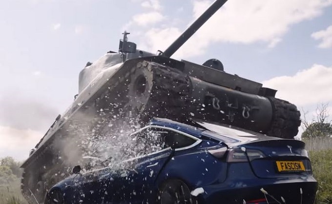 L’azione di protesta di Turner, ripresa in un video pubblicato su YouTube, è stata organizzata dal gruppo politico britannico “Led By Donkeys” ed è andata in scena in un campo inglese dove la Tesla Model 3, dotata di un emblematica targa posteriore con la scritta “FASCISM”, è stata travolta e distrutta dal carro armato guidato da Turner che ha rimarcato il messaggio lanciato con il suo gesto: “Abbiamo già schiacciato il fascismo una volta, e lo schiacceremo ancora”.
